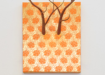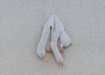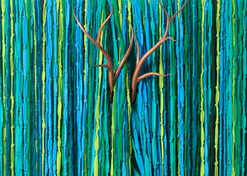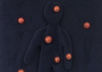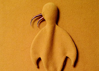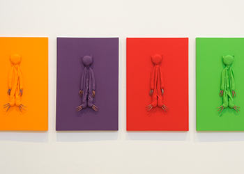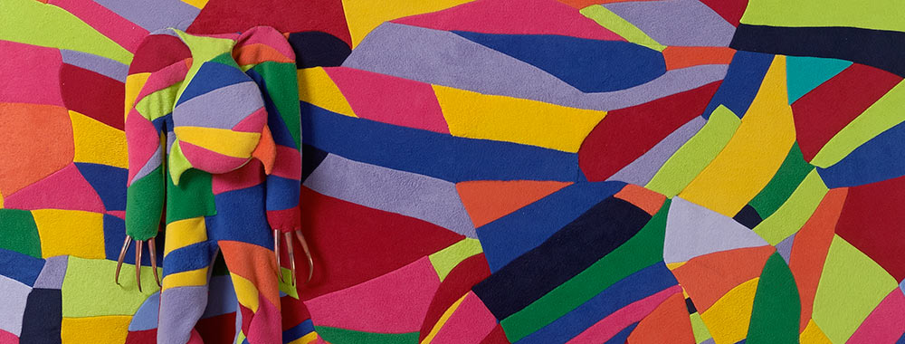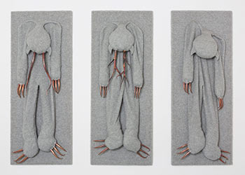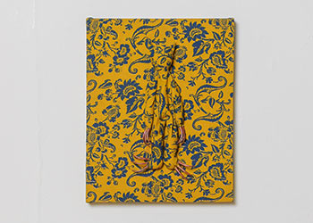 Camouflaged amongst the surface of the canvas, are curious creatures made from the same fabric. They are armed with claws, horns and beaks, belying their apparent vulnerability as they hang limply unstuffed. The donning of camouflage is an act of mimicry where the figures are almost the same, able to ‘fit in’ but not quite.