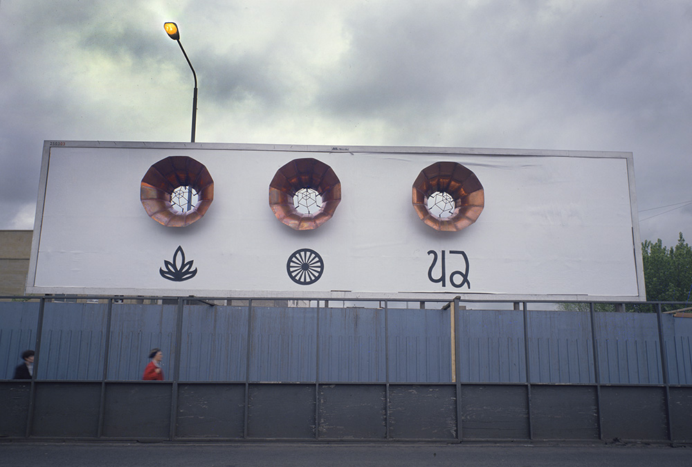 Two billboards faced each other across the street. On one with 3 speakers was painted a symbol — a wheel, a lotus flower and the initials PK in Punjabi. The other had one larger speaker placed against a large green octogram pattern. It was unclear who the large copper “speakers” represented. The project was shown during the April 1992 elections. On the billboard next to hers was a large advert telling people to vote. Did the billboards inadvertently represent another unknown political party? Each billboard is 3 x 13 m and is made of copper, steel, rubber, and spray paint. Commissioned for the B.B.C. Billboard Art Project, Cathedral Street, Glasgow, Scotland.
