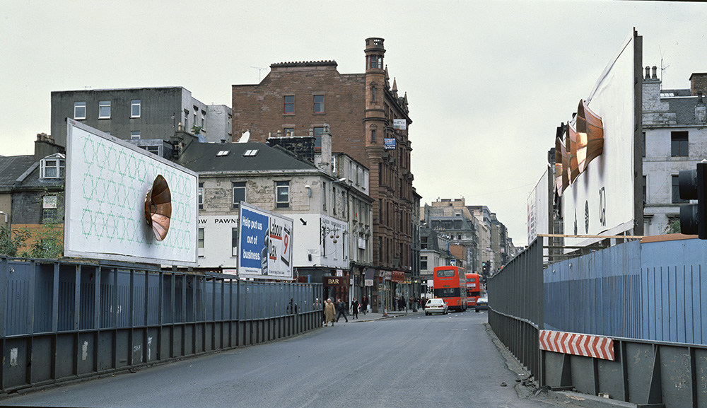 Copper, rubber, steel and paint. Two billboards 3 x 13 metres, Catherdral Street, Glasgow, Scotland.