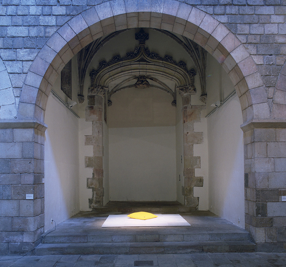 La Capella: Cushion Cushion 1994 Fabric and marble 20 x 200 x 200 cms Installation view, La Capella, Barcelona, Spain Photo: J.Calafell & R.Feliu (left) Photo: Peter Lundh (right)