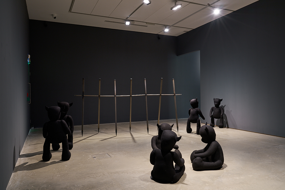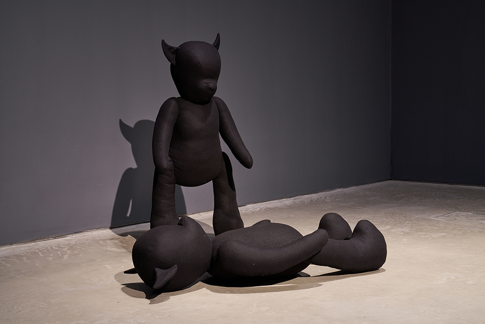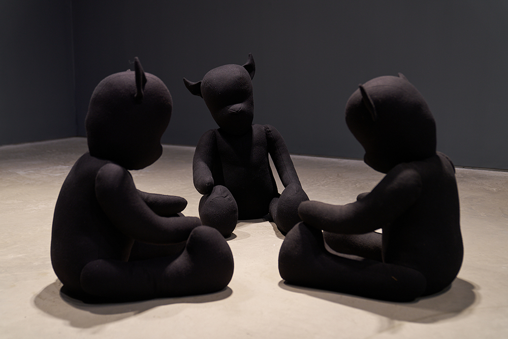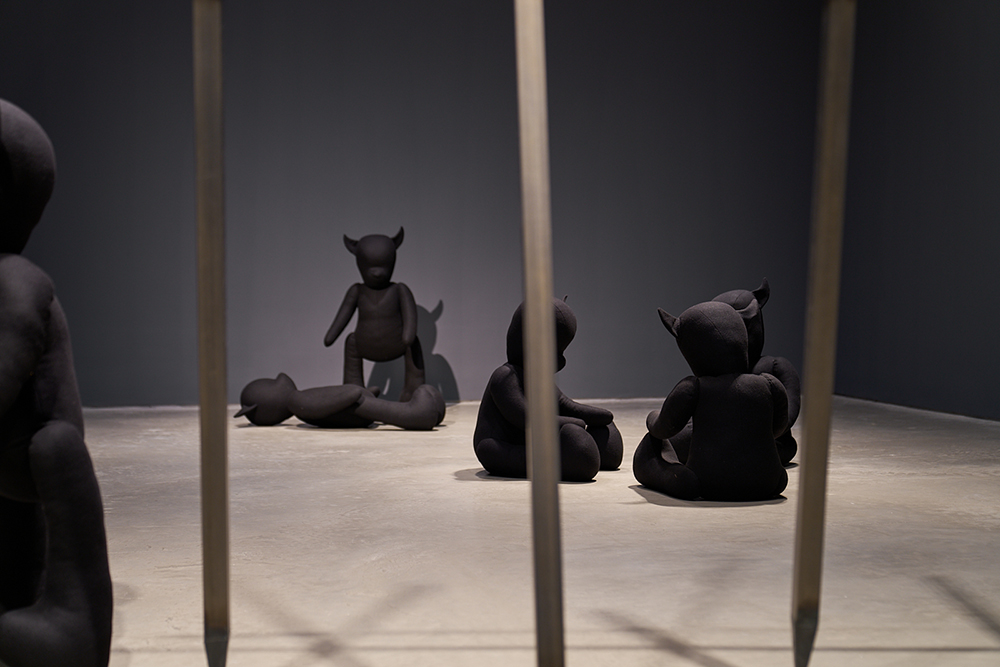 “I want people to wonder whether these teddy bears are friends or foes, are they cuddly or dangerous or both? People have called them ‘devils in making’, with their pointed ears. Two of them can be read as a mother looking out for a child, but is he sleeping or ill? A group of three are enclosed, facing each other. Are they plotting, and if so, what are they planning to do? Another pair could be in conversation or confrontation. I do tend to focus on the home, but this feels more like a playground, courtyard or prison.”