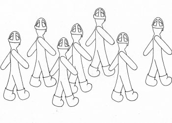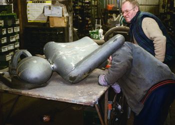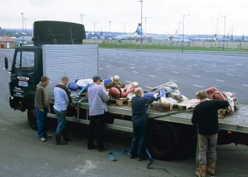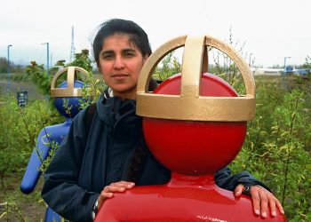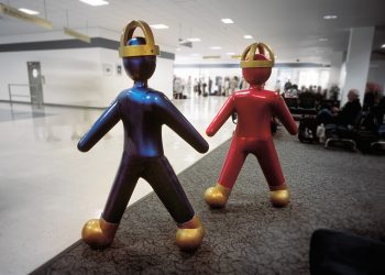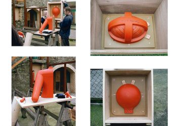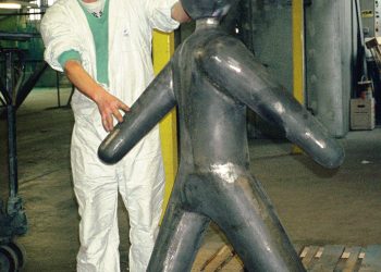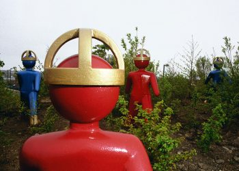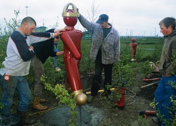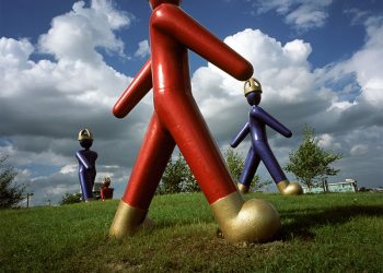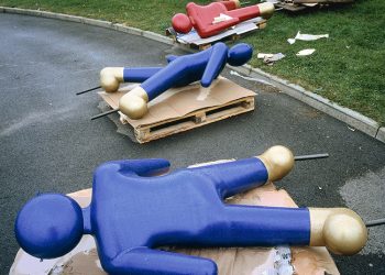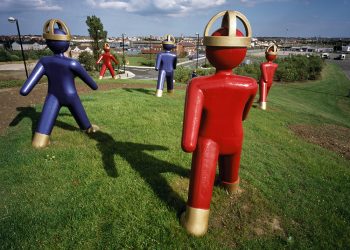 Dudes consist of 18 human figures made of ductile cast steel and painted either blue or red. The figures are marching over a hill towards the ferry terminal at North Shields with two already having reached their destination. The work references the Port’s past as a magnet for invaders and traders. Commissioned for Art on the Riverside in North Tyneside, Newcastle, UK.