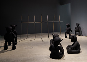 DP The idea of hiding is interesting because it reminds me of the last room of your show in which the black teddies in the black room are arranged in formations that look like children’s games, which speaks to how children love to play hide and seek. The way I read that room is like a tableau of different types of children’s games in a playground. You have three in a circle, you have one that looks as though it’s playing doctors and nurses with a patient on the floor, and one just resting slumped against the wall. There are also teddies who are guarding the way in, which children also do; they can be very territorial. It seems like a microcosm of the way in which global politics plays out – people playing games with each other all the time, and those games can be benign, but they can also be dangerous. And there’s a tension in that: which way will these games pan out? Who will win, who will lose.