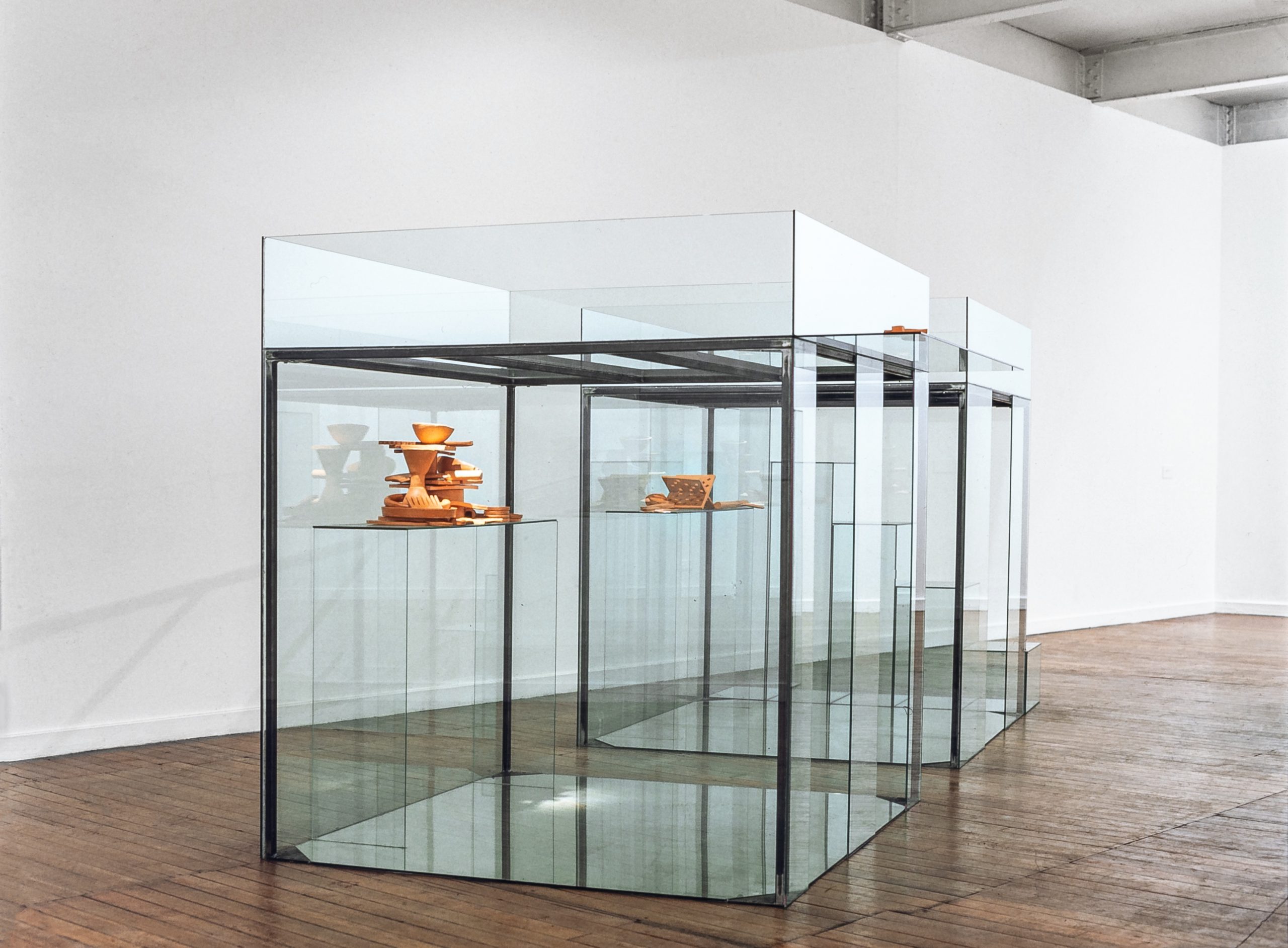 Clay household objects, common and usual, are set inside glass cases, which are called Glasshouses (1991). They are offered as if in an archaeological museum’s display case, the exit point for the rationalization of another time or place, enlightenment through presentation. A rich reddened clay gives them a quality of being from another land, heightening our assurance that the other does exist, either in our memory or in the world; bowls and combs to serve the function of displacement. Glass cases holding glass shelves, with their edges tinged green, tinged with colour and sense – archaeology in the service of estrangement.