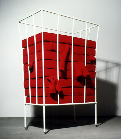 In her personal universe, the idea of ‘home’ is associated with [one’s] ‘own personal space’ and related to [one’s] I own experience’. Home is security, but the manifest vulnerability in these works invites one to meditate on loss and deracination. It is a ‘hearth and home’, possessing neither door nor window, in which security is by no means ensured. In the very specific house of experience that concerns her, the presence of the element ‘bed’ has come to occupy an obsessively central place: ‘my house is my bed, the bed in which I sleep’. Hers is an artistic house constructed upon the fragility and doubt that are generated by the inertia of displacement. The violent friction to which it is subjected is the agent through which inner security is lost. The work has a compensatory function. That it also contrives to testify so effectively to this existential condition makes it interesting, valuable and timely.