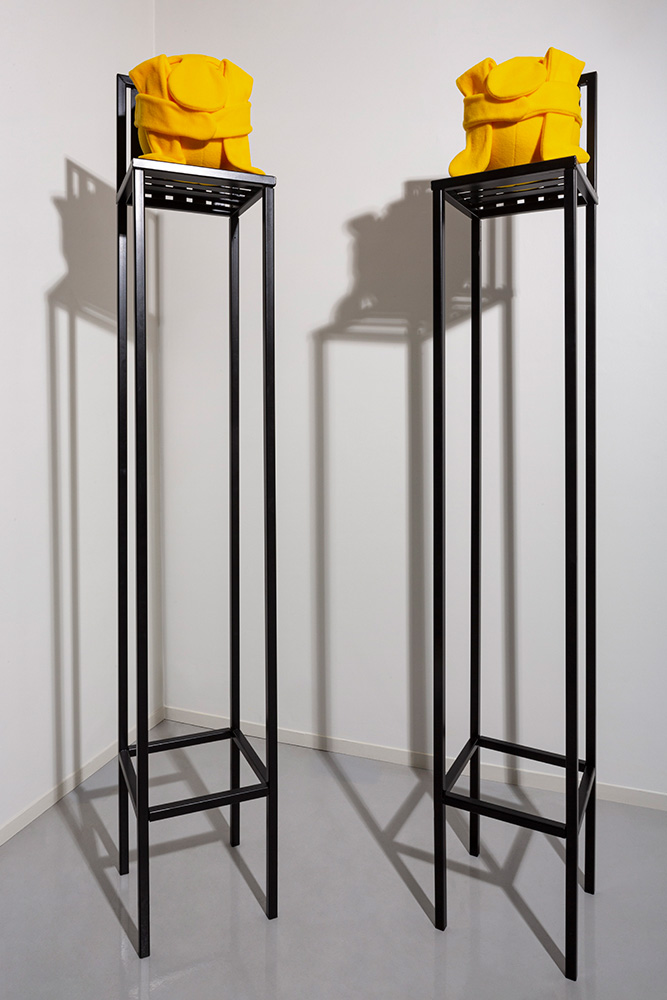 Tall Chairs (1996) is the earliest work on display in Outgrown. It occupies a curious position within Kaur’s practice, embodying early influences and concerns but also looking forward to current preoccupations. The work was first presented in 1996 at the Mead Gallery, University of Warwick as part of Kaur’s first solo exhibition, Cold Comfort, held concurrently at the Mead and at Ikon Gallery, Birmingham. Entirely fabricated rather than found, the work comprises two black steel chairs towering over seven feet tall. Atop each chair rests a small genderless, toylike figure – no more than a blob with head, arms and legs – made from polar fleece in a dazzling shade of sunshine yellow. The two figures cower, apparently too afraid to look up or down. There are many tensions here. Firstly, the nightmare scenario of attempting safety through climbing, only to find yourself stuck in mid-air with no means of escape. Equally striking is Kaur’s long-held interest in transforming the scale and height of things to increase dramatic tensions, in this case by extending the proportions of a chair far beyond ergonomic usefulness. There are also multiple material collisions, particularly the charge between the fearful fleece bundles perched perilously on unforgiving powder-coated black steel. Yet, although this work conveys a precarious situation, it remains, in all respects, well made and precisely executed: inherently strong. As Kaur has reflected recently, her work is precarious yet not fragile.[11] This unusual combination, of precarity and strength, sets Kaur’s work apart from many of her contemporaries who were exploring the vulnerabilities of perishable materials or distressed found objects.