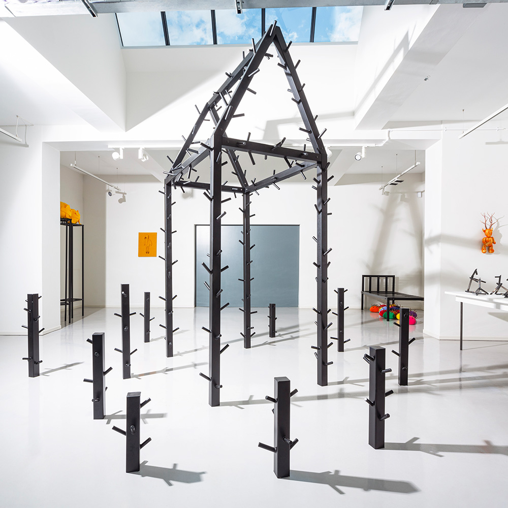 Kaur’s increasing interest in the power of constituent parts has directly informed her recent work. Overgrown House (2020) provides the centrepiece for the Outgrown exhibition. Towering over three metres tall, this foreboding powder-coated steel structure reminds us of the sinister domestic architecture of fairy tales and nightmares. Peppered with the nuts and bolts of new growth, each sprout clipped uniformly to suggest the presence of an overseeing custodian, the house speaks of an uneasy kind of tug of war between presence and absence, nature and culture, progress and stasis. The house is surrounded by a copse of stunted shoots, creating a context, a forest, a private domain. This intriguing scattering of parts recalls the preoccupation with repeated units found in minimal and post-minimal sculpture. There is also a spirit of playful unfinishedness akin to completing a house of Lego only to discover a baffling assortment of unused parts. At a studio level, Kaur’s interest in parts serves as an important reminder of the practical considerations informing the making of large-scale sculpture. Her initial decision to make works in sections that can be broken down and packed away neatly stemmed from a pragmatic need to consider storage and transport implications. Over time, she has come to realise that there is significant creative potential to be found in a modular approach, and she enjoys the technical challenge of making units that can fix together and come apart again.